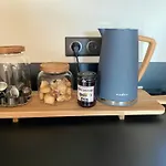 Zu den Selbstversorgereinrichtungen gehört eine voll ausgestattete Küchenzeile mit einem Wasserkocher, einem Kühlschrank und einem Herd.